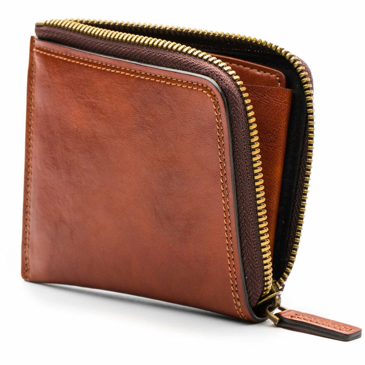 The new Zip Wallet is a perfect addition to your collection of accessories. This zippered wallet has a beautiful antiqued brass finished zipper. Faithful to the Dolce line, the zippered wallet has the distinct double stitch and raw edge construction. Dolce is an Italian veg-tanned, hand-stained leather polished to a low luster allowing the leather to mature over time.Â