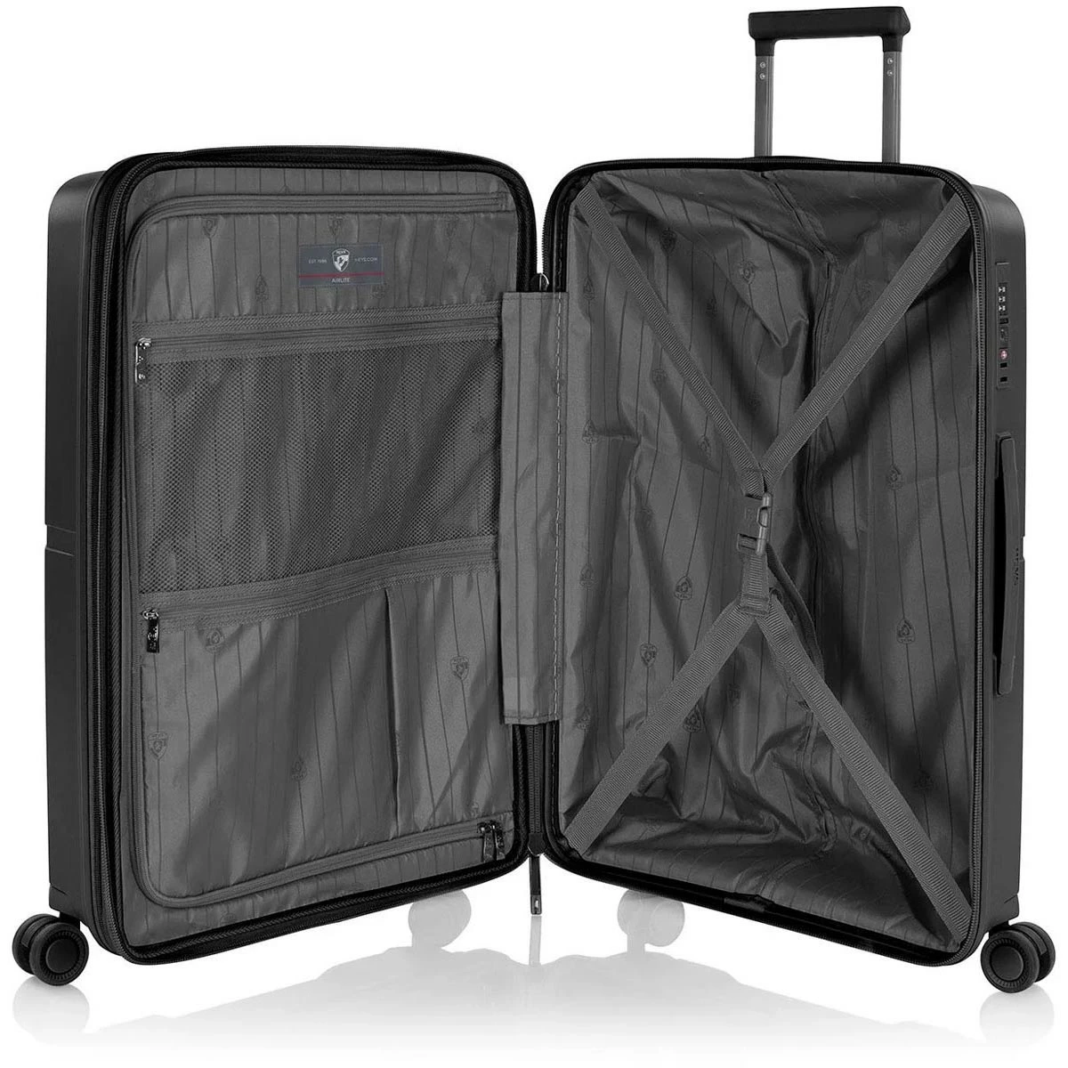 The Heys AirLite 26″ Expandable Spinner is lightweight and impact resistant able to withstand a 750lb impact without breaking. It is available in six subtle shades with a matte sheen and stylish colour-matching wheels, handles, lock, zippers and trim. It features a fully-lined interior with zippered divider, buckled compression straps and zippered pockets as well as an expansion system that allows for an extra 20% in packing capacity. The 360° spinner wheels allow for effortless motion in different terrain and the flush mounted built-in color matched TSA approved combination lock help keep your valuables safe.