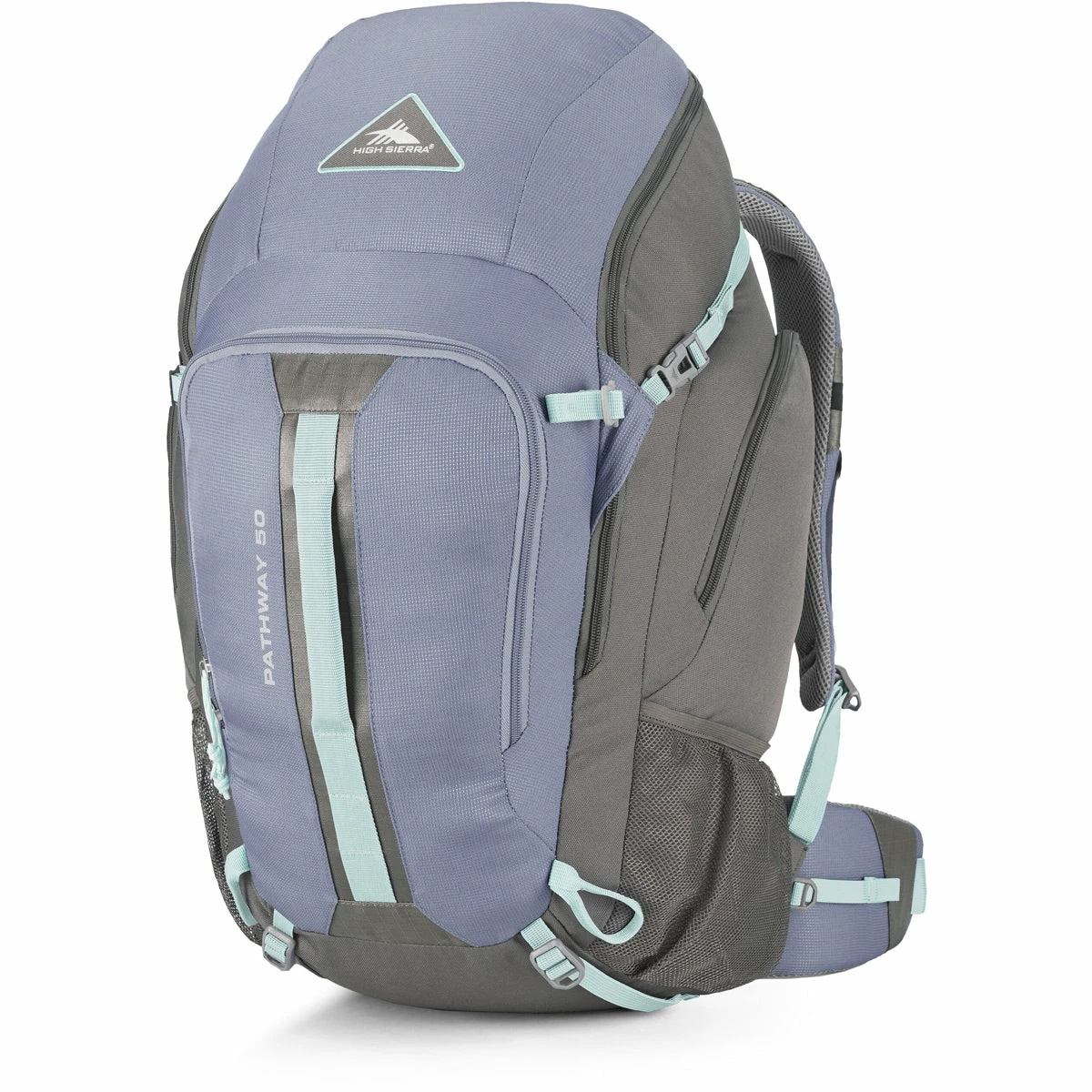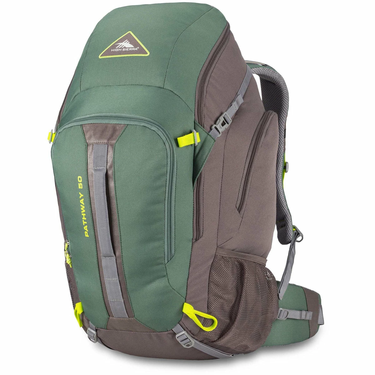 - LARGE MAIN COMPARTMENT and MULTIPLE POCKETS: this 50 liter hiking backpack from High Sierra features deep zipper access to large main compartment; includes a large front zippered pocket with internal organizer and stretch mesh exterior pockets