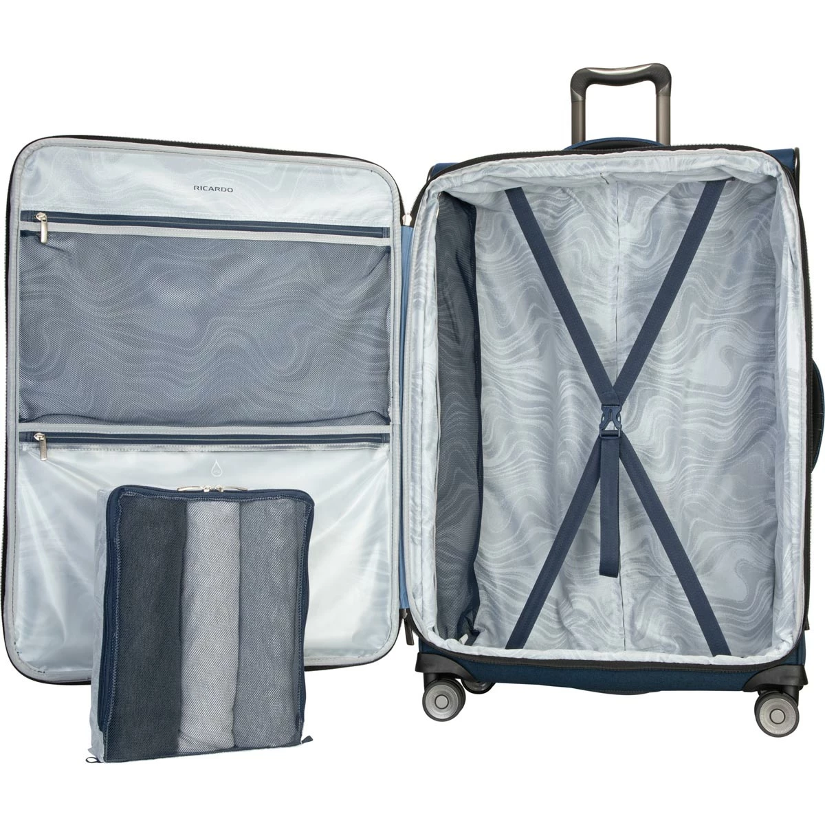 - Water-resistant removable TSA-friendly toiletries pouch