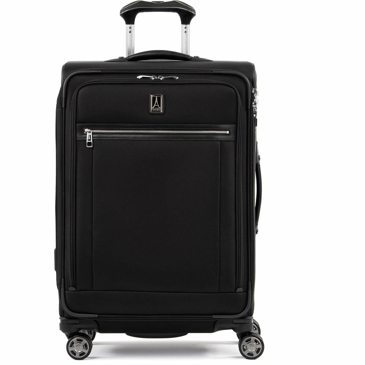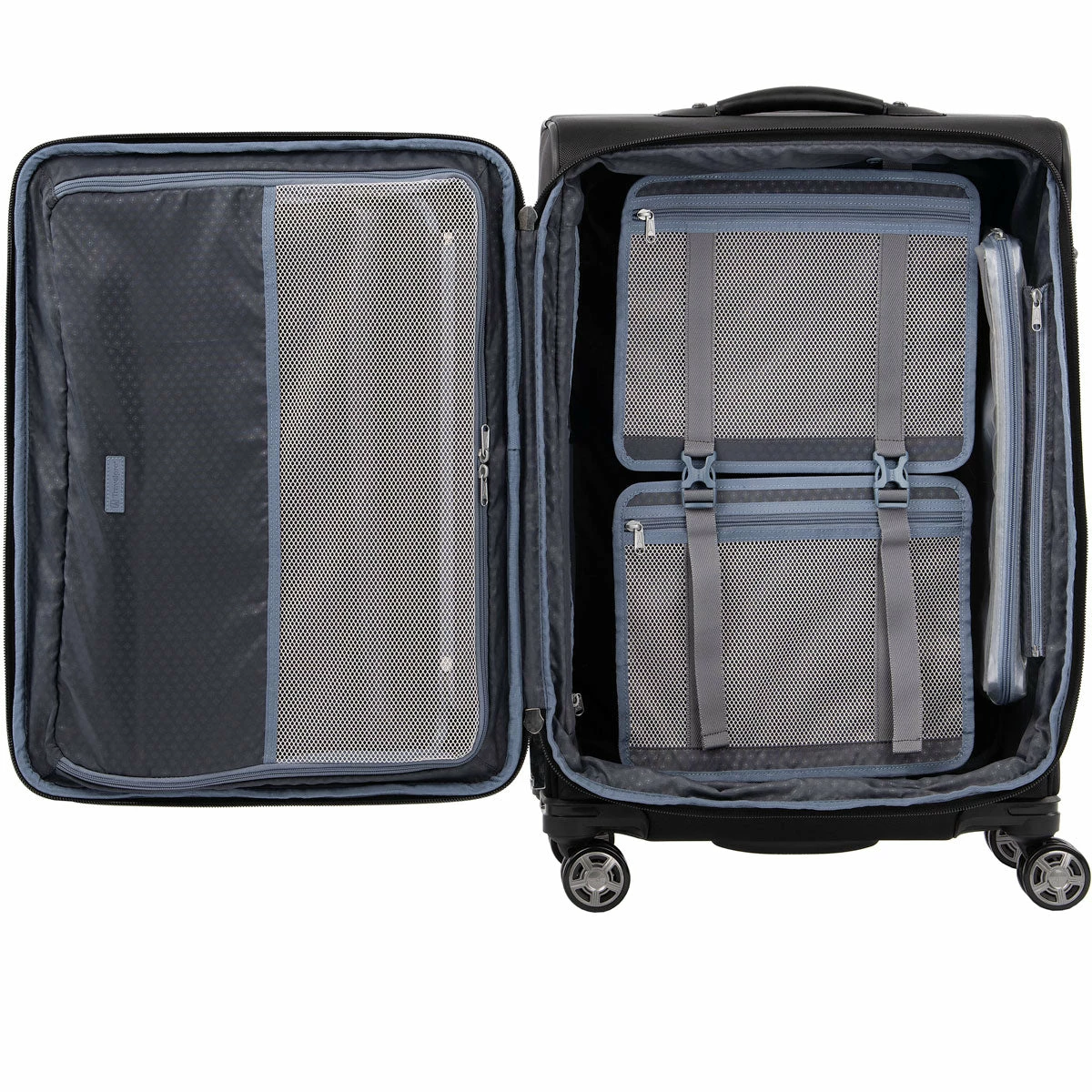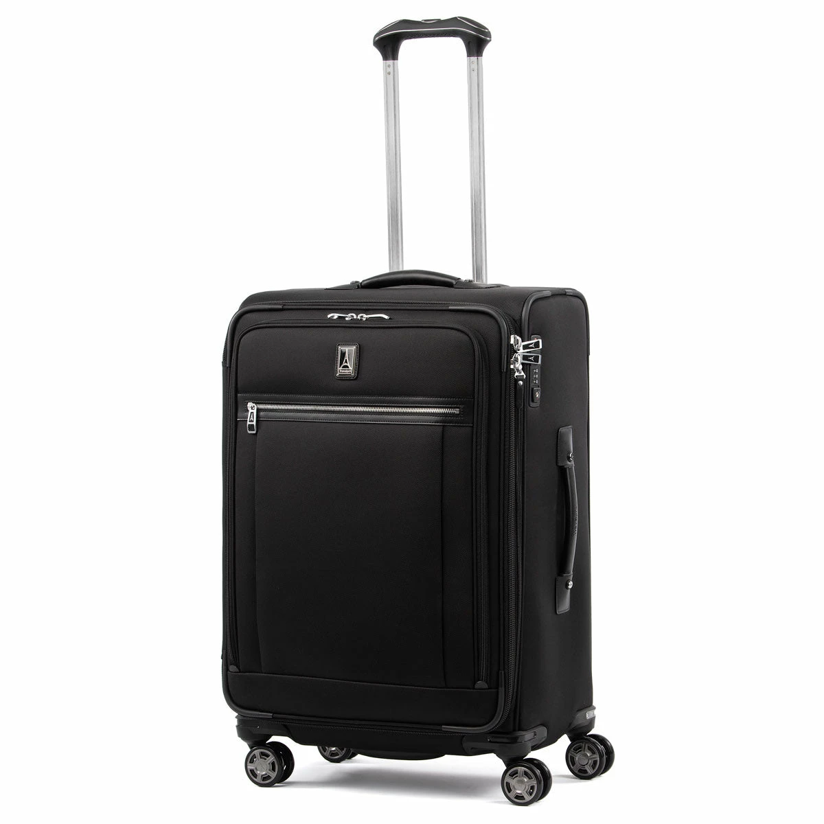 Finally, great looking checked luggage that is as functional and durable as it is stylish. The Platinum® Elite 25” Expandable Spinner is perfect for medium and long trips, accommodating everything you need, guarding against wrinkles with a built-in suiter and keeping everything organized under a deluxe tie-down system with integrated accessory pockets. Constructed with premium fabrics, leather accents and chrome zippers, this gorgeous bag also features a tip-resistant tapered expansion option that provides up to 2” additional packing capacity.