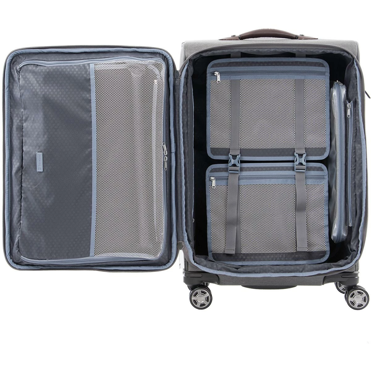 Maximize your carry-on with sophisticated style. The Platinum Elite 2pc Spinner Set includes a 21” Expandable Carry-On Spinner and a 25″ Expandable Spinner. Each spinner delivers big on form and function with a tip-resistant expansion that offers up to 2” more packing capacity, deluxe tie-down system, and the carry on includes an integrated accessory pockets and a removable quart-size wet pocket that is TSA compliant and perfect for toiletries. Plus, the drop-in, fold-out suiter is specifically designed to accommodate hanging clothes and prevent wrinkling.Â