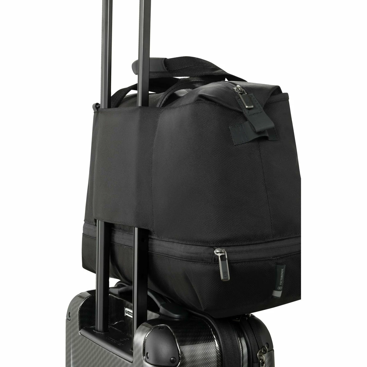 - Rear sleeve for sliding bag over wheeled luggage handles